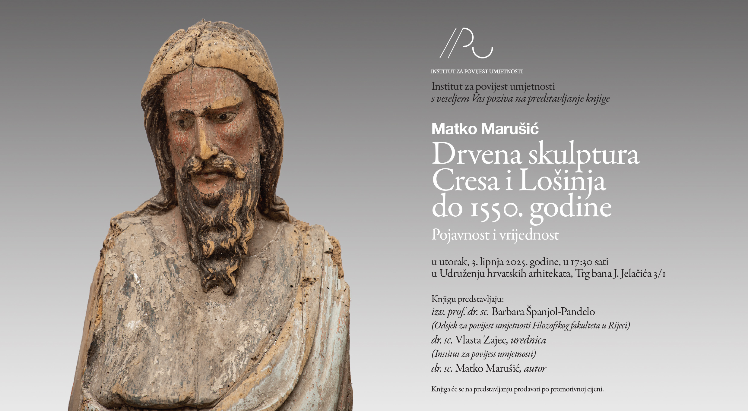 Knjigu će predstaviti izv. prof. dr. sc. Barbara Španjol-Pandelo (Odsjek za povijest umjetnosti Filozofskog fakulteta u Rijeci), dr. sc. Vlasta Zajec, urednica (Institut za povijest umjetnosti) i autor dr. sc. Matko Marušić (Institut za povijest umjetnosti).